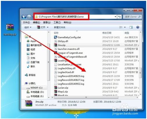 7、接著將該壓縮文件“hanbing.zip”拖動復制到“C:\Program Files\騰訊游戲\英雄聯(lián)盟\Game”文件夾下。
