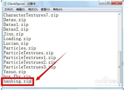 8、雙擊打開“C:\Program Files\騰訊游戲\英雄聯(lián)盟\Game”文件夾中的“ClientZips.txt”文件,在文件最后添加“hanbing.zip”,并保存關閉。