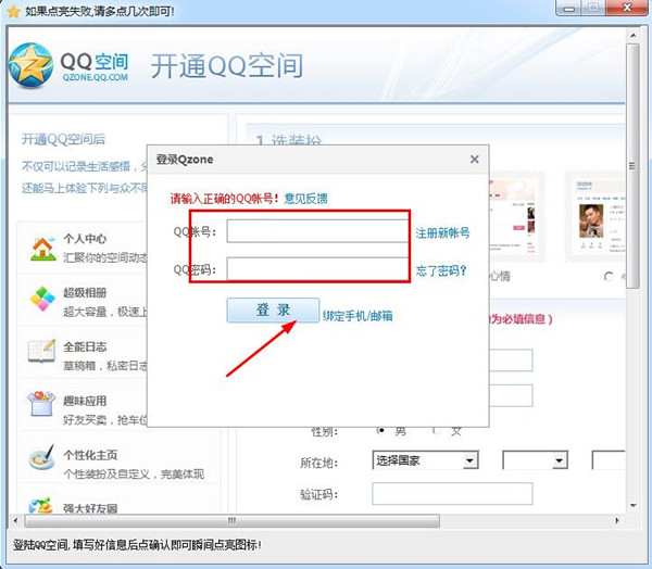2、輸入QQ號,跟隨他的提示一步步點(diǎn)亮QQ空間圖標(biāo)