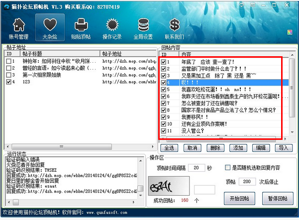 3、自定義回帖內(nèi)容,數(shù)量不限,可以按順序回復(fù),也可以隨機(jī)回復(fù),非常人性化!回帖時間間隔可以自定義,可快可慢!