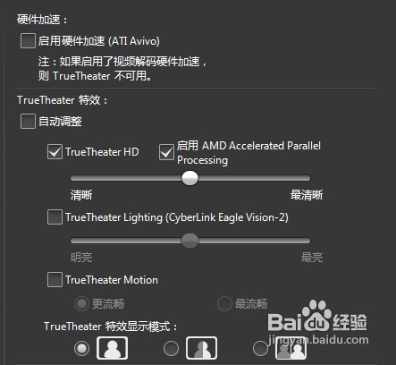看到TrueTheater特效這一欄,勾選TrueTheaterHD,下面的清晰度自己調(diào)整。如果是AMD的cpu還可以勾選AMD Accelerated Parallel Processing這一項(xiàng)