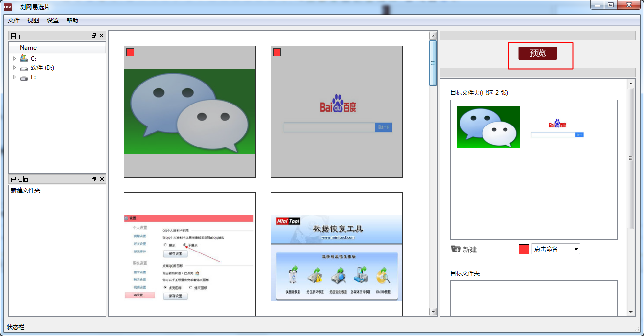 3、勾選你要的照片,將選中的照片直接拖選到右邊方框中,點擊預(yù)覽保存