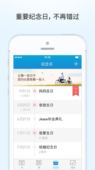 獨(dú)立的紀(jì)念日視圖,支持農(nóng)歷生日,畢業(yè)日、結(jié)婚紀(jì)念日、愛人生日一目了然