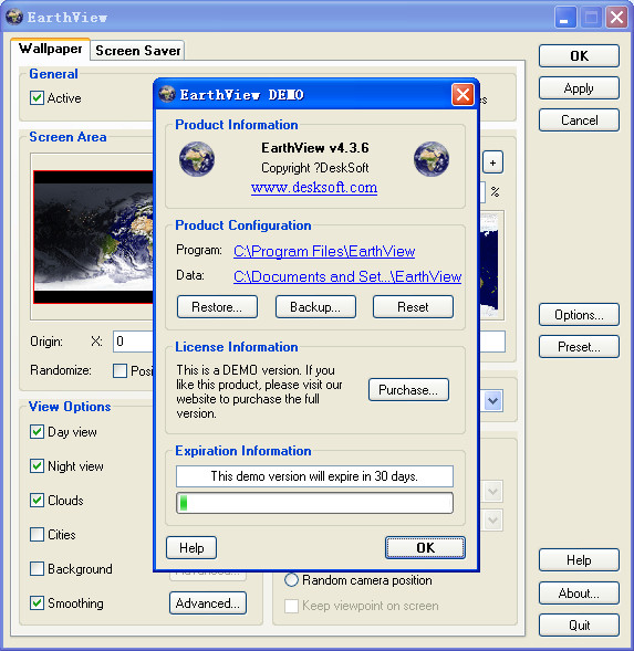 EarthView 能產(chǎn)生高達 1600x1200 高品質(zhì)解析度的畫面,而顯示模式可以地圖 (map) 或地球儀 (globe) 的方式呈現(xiàn)。其它的顯示資訊還包括地理疆界、國界、地形、城市分布…等,都能由使用者自行修改選項及設(shè)定參數(shù),達到最佳的觀看效果。【功能介紹】