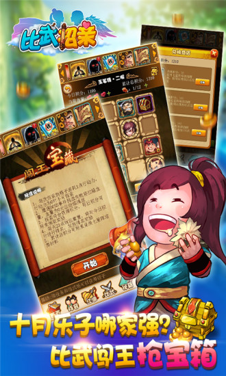 比武招親360版有著頂級(jí)配樂,唯美畫面,絕美卡牌,上傳照片,社區(qū)交友,搶親闖關(guān),喝酒比武,快意恩仇,這是一個(gè)武俠世界,又不僅僅是武俠世界!相信每個(gè)人心中都有一個(gè)武俠夢(mèng),那《比武招親》將讓你的2014刻骨銘心!