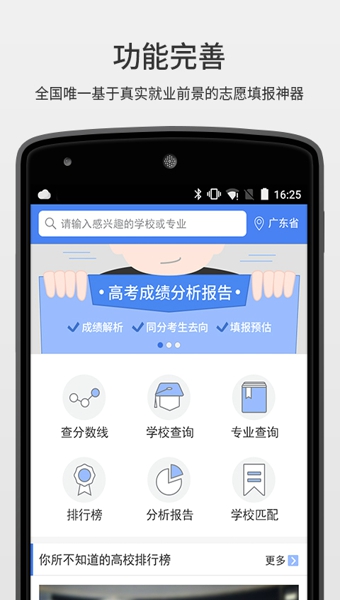 1、權(quán)威錄取數(shù)據(jù):來(lái)自考試院權(quán)威同步的3000萬(wàn)條考生錄取數(shù)據(jù), 覆蓋全國(guó)2595所院校,1214個(gè)專(zhuān)業(yè)(包括本專(zhuān)科),精確到往年每一個(gè)考生的錄取去向;2、獨(dú)家就業(yè)報(bào)告:過(guò)往5年4000萬(wàn)高校畢業(yè)生最真實(shí)就業(yè)數(shù)據(jù),學(xué)校就業(yè)“錢(qián)景”如何,大數(shù)據(jù)之下一目了然;