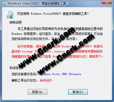 執(zhí)行安裝前,請先確認(rèn)您已經(jīng)將 Windows Vista/2008/7 安裝光盤中的 bootmgr 文件和 boot、sources 文件夾按照原結(jié)構(gòu)復(fù)制到本地硬盤的任意分區(qū)(但不能是 Windows 安裝的目標(biāo)分區(qū))根目錄。