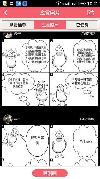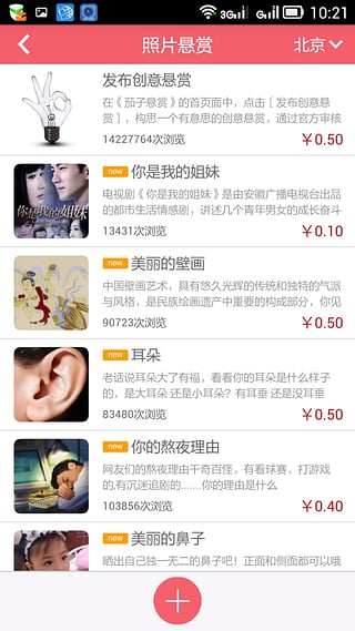 “茄子懸賞”是專業(yè)的懸賞發(fā)布平臺(tái);拍攝圖片是完成懸賞的方式。同時(shí),“茄子懸賞”也是智能手機(jī)廣告平臺(tái),為廣大的廣告主提供精準(zhǔn)的產(chǎn)品營銷和品牌推廣服務(wù)。企業(yè)用戶可以通過該應(yīng)用發(fā)布懸賞任務(wù);個(gè)人用戶拍攝照片來完成應(yīng)賞的任務(wù)。使用方法:企業(yè)用戶點(diǎn)擊“發(fā)布”按鈕,可以按照流程發(fā)布懸賞的文字描述和價(jià)格;個(gè)人用戶點(diǎn)擊“領(lǐng)取任務(wù)”,可以按照流程拍攝照片完成任務(wù)和領(lǐng)取報(bào)酬。