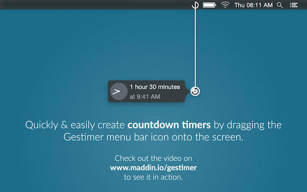 Gestimer 能夠設(shè)置的提醒時(shí)間與你的屏幕大小有著密切的聯(lián)系,就拿我的 Macbook Air 來(lái)說(shuō),當(dāng)我的 Gestimer Menubar 圖標(biāo)位于 Menubar 最右側(cè)時(shí)(我需要 Bartender 的幫忙幫我把所有圖標(biāo)收起來(lái)),我向屏幕左下角的方向拉到盡頭最多能設(shè)置 9 個(gè)小時(shí)后的提醒。