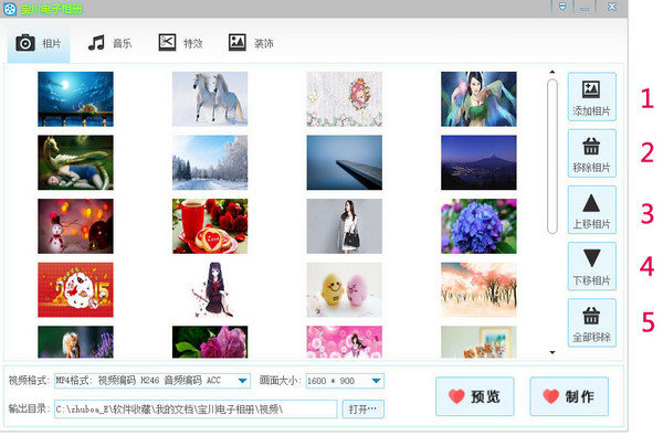 1.支持批量添加圖片,對(duì)圖片排序,移除等操作,支持jpg,bmp,gif,png格式圖片。2.支持添加音樂,暫時(shí)只支持mp3,wav格式音樂。