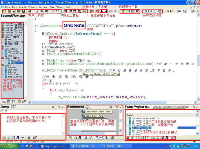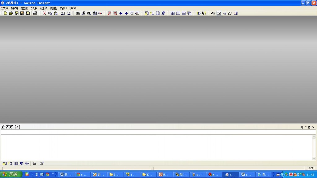 一、啟動界面啟動Source Insight程序,可以進下圖界面。在工具條上有幾個值得注意的地方,如圖所示,圖中內(nèi)凹左邊的是工程按鈕,用于顯示工程窗口的情況;