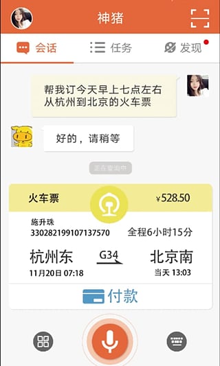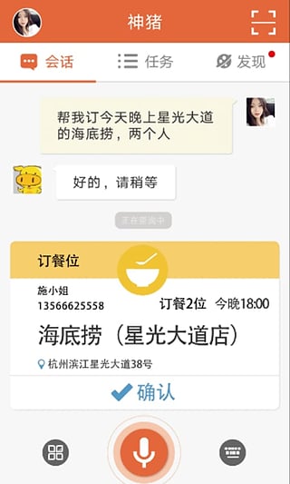 集成了各種生活服務(wù),你可以讓「神豬」幫你叫外賣、訂餐位、買車票、訂酒店等等,告別手機(jī)內(nèi)數(shù)百個(gè)服務(wù)應(yīng)用搞定事情只需說(shuō)話或打字,幫你更省時(shí)間