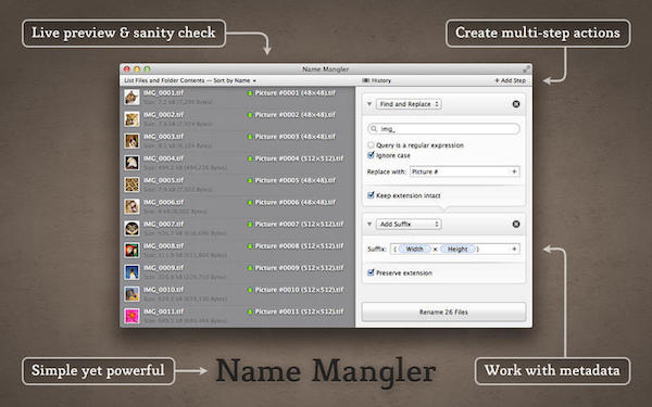 Name Mangler是不僅僅只是一個通用的命名實用 - 它是一個無限數(shù)量的特定任務(wù)重命名公用事業(yè):Name Mangler for Mac的Droplets讓存儲配置變得異常簡單,還能不停的反復(fù)使用和替換它們。只要您的文件拖放他們。