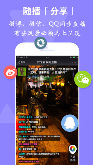 -將直播分享到微博、微信和QQ,你的朋友可以立即與你互動。