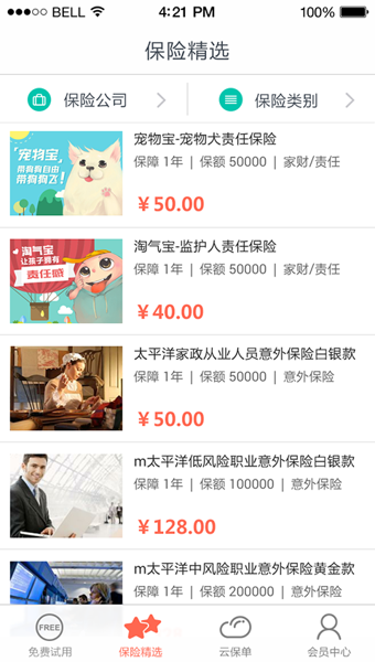 -保險(xiǎn)產(chǎn)品精選,根據(jù)用戶實(shí)際需求精挑細(xì)選的特色保險(xiǎn)產(chǎn)品,解決用戶產(chǎn)品選擇困難問(wèn)題。-免費(fèi)試用,從實(shí)用性出發(fā),精選各個(gè)保險(xiǎn)公司免費(fèi)保險(xiǎn)產(chǎn)品,供用戶免費(fèi)領(lǐng)取,體驗(yàn)有保障的生活。