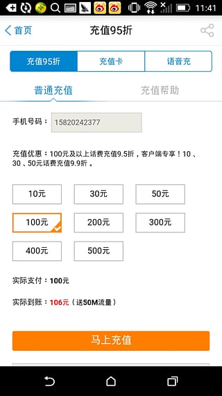 2、充值95折:登錄客戶端在線充值均可享95折優(yōu)惠,提供充值卡充值、在線充值和語音套餐;