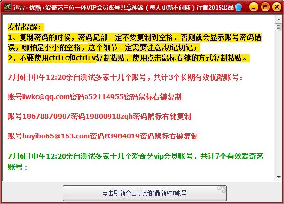 迅雷+優(yōu)酷+愛奇藝三位一體VIP會員賬號共享神器是一款多功能VIP會員賬號免費(fèi)共享神器。這款軟件專門針對優(yōu)酷、愛奇藝、迅雷會員賬號進(jìn)行免費(fèi)共享,相對于網(wǎng)絡(luò)上的其他同類型vip帳號共享器,這個(gè)軟件提供了三大常用軟件的最齊全的帳號密碼,每天穩(wěn)定更新幾十個(gè)有效。歡迎下載使用。