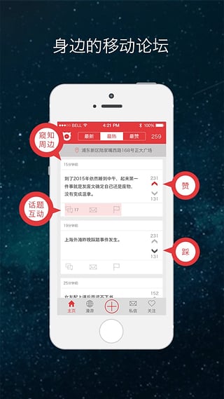 無論是在校園、大公司、城市CBD、生活社區(qū)、體育比賽場(chǎng)館、大型活動(dòng)所在地等各類熱鬧的地方,你可以隨時(shí)的使用“微現(xiàn)場(chǎng) ”,自由地與你本地周圍的人分享,瀏覽周圍人們所看所想,了解周圍人們的各種秘密,參與周圍人們的話題討論,和你感興趣的人私信交流。