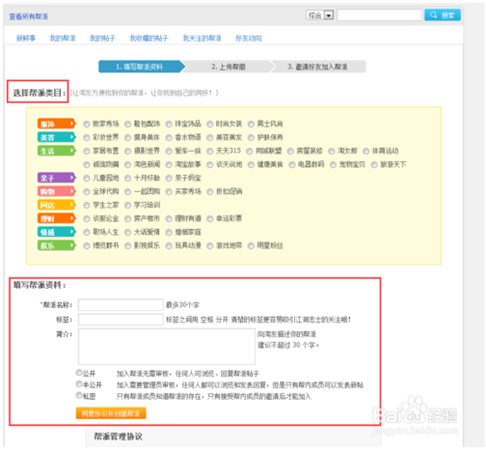 5、我們看到下面的內(nèi)容,根據(jù)上面的提示,我們按步驟填好資料就可以創(chuàng)建自己的幫派了