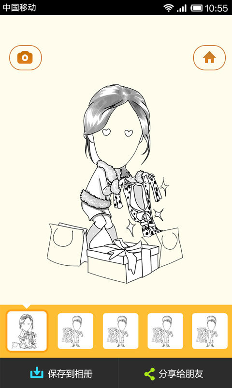 4、一鍵分享,共享快樂:生成漫畫表情后,不僅可以保存到本地,還可以一鍵分享,無論是聊天還是做頭像都只要一鍵操作。