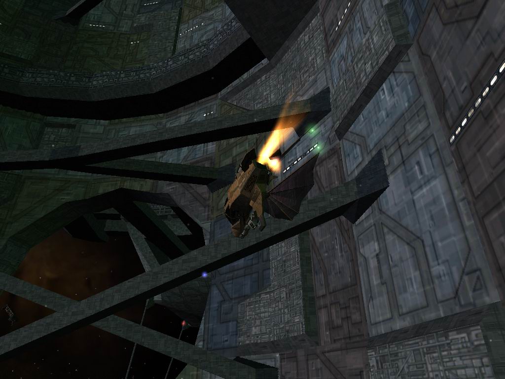 要潛入要塞,必須首先摧毀能量罩旁的4座發(fā)動(dòng)機(jī),但能量罩旁赫然停泊著一艘戰(zhàn)列艦!左側(cè)則駛來大批敵機(jī)。Ozu一聲令下,血龍戰(zhàn)隊(duì)與敵機(jī)交上了火,摧毀發(fā)動(dòng)機(jī)的重任落在了我肩上。我保持巡航速度,飛越拱門上空,快速逼近敵戰(zhàn)列艦。戰(zhàn)列艦發(fā)出猛烈的炮火及各種導(dǎo)彈,我一面左右躲閃,依靠高速度躲避其火力,一面施放煙霧彈引開導(dǎo)彈,還丟了兩顆雷逼開追來的敵機(jī)??斓綉?zhàn)列艦時(shí),我按下機(jī)頭,戰(zhàn)機(jī)迅速俯沖下去,此時(shí)才解除巡航引擎。我貼在戰(zhàn)列艦的表面,逐漸降低速度,直到停在它的一個(gè)凹陷處。哈哈,戰(zhàn)列艦?zāi)梦乙稽c(diǎn)辦法都沒有了,我的魚雷、導(dǎo)彈、激光和雷一齊發(fā)出,在猛烈的攻擊下沒用多久就摧毀了這艘戰(zhàn)列艦。過程中雖遭敵機(jī)的攻擊,但巧妙的躲避位置、殘留的維修物品和友軍的掩護(hù)為我贏得了時(shí)間。