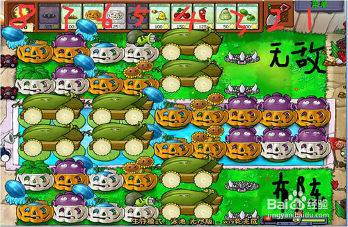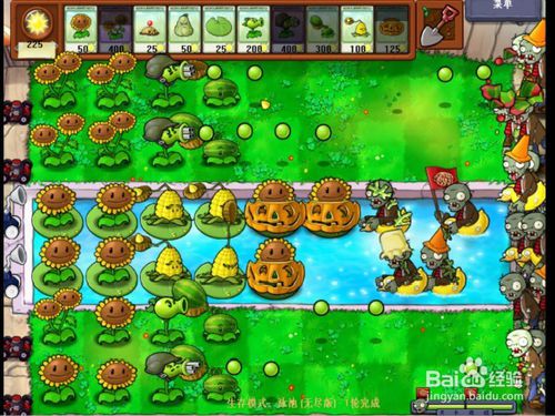1、第一輪(草坪上),前兩排全部種太陽花(包括水面),防守就用雙發(fā)豌豆射手種在第三排,西瓜投手種在第四排,土豆雷,倭瓜用來預(yù)防萬一,還有玉米射手種在第五第六排(后期用來種玉米加農(nóng)炮)。