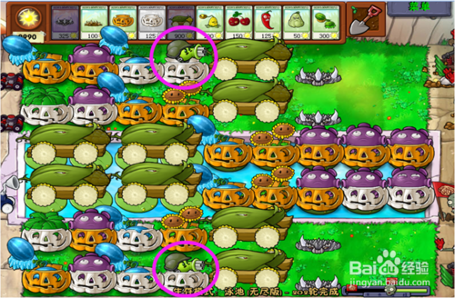 9、在每次每個階段僵尸出來時,必須要選擇的武器有6個,2個地刺,2個南瓜罩,玉米加大炮。千萬要注意,其余的武器根據(jù)出來僵尸的類型選擇。