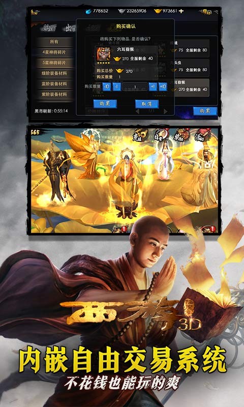 厭倦了傳統(tǒng)卡牌手游“一切靠抽”的坑錢設(shè)定嗎?《西游降魔篇》首創(chuàng)全自由交易模式,無論是極品卡牌還是強(qiáng)力裝備,所有一切道具全部開放交易!不花錢也能玩得爽!