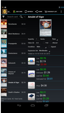 萬智牌收藏可以讓你節(jié)省萬智牌卡你快速直接地顯示在你的設(shè)備上。魔法風(fēng)云會愿望單讓您能夠迅速方便的保存您想要的卡牌,并顯示圖片、各個知名網(wǎng)站的現(xiàn)時價格(使用您所在位置的貨幣)、可取得的延伸系列、卡片名稱等讓您能更方便的收集和交易卡牌的信息
