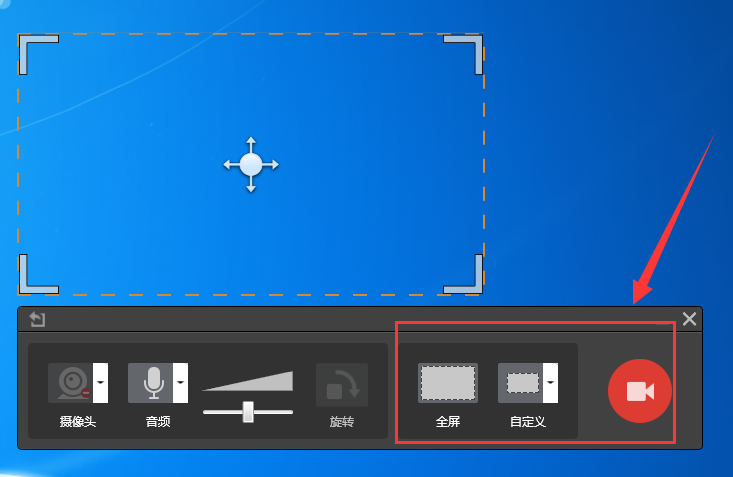3、接著在彈出的錄屏窗口中我們可以直接選擇全屏錄制,也可以選擇自定義來調(diào)整錄制區(qū)域的大小;