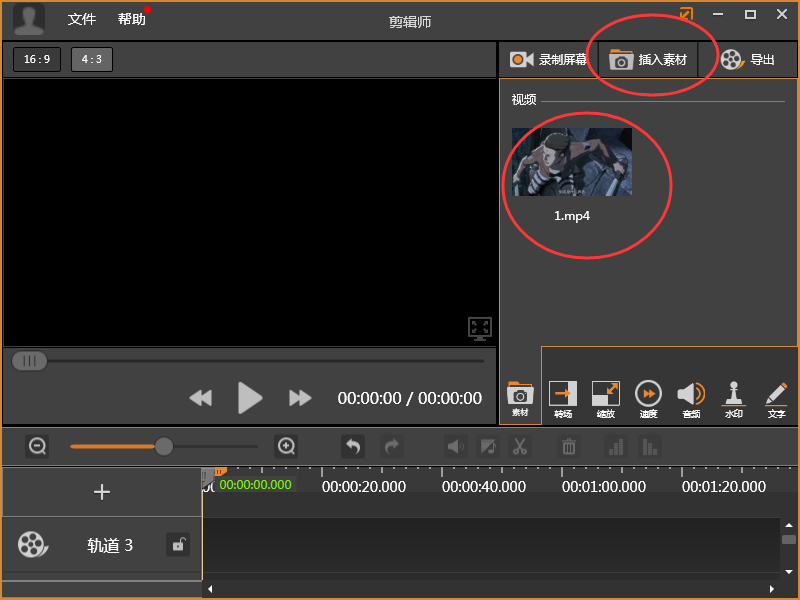 2、登錄完畢后在剪輯師界面右上角找到“插入素材”按鈕,并將想要調(diào)整播放速度的視頻添加進來;