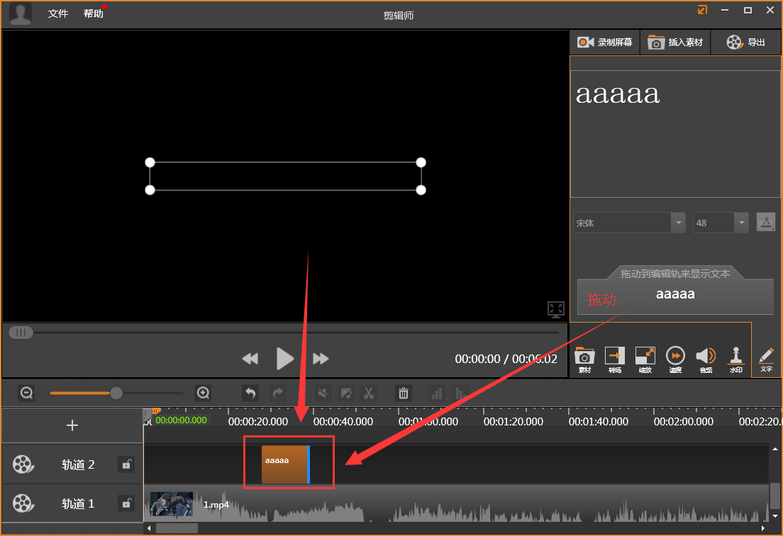 5、之后拖動文字也到素材區(qū),通過拖動素材區(qū)文字的邊框來設置它出現(xiàn)時間的長度,拖動它在視頻進度條上的位置即可設置它出現(xiàn)的時間,如下圖所示: