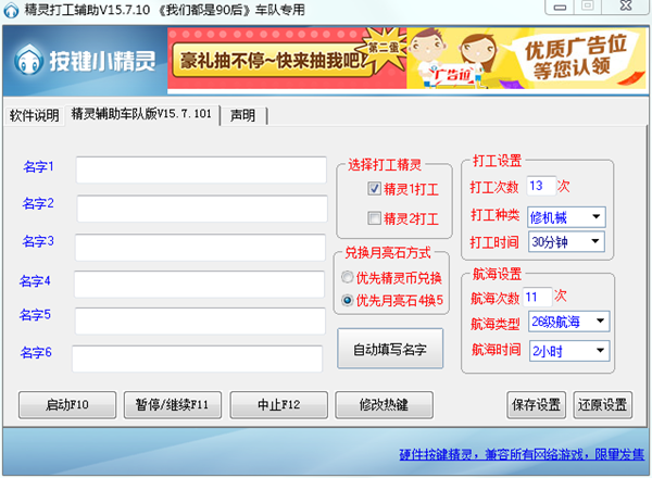 QQ飛車(chē)精靈輔助功能:自動(dòng)打工 自動(dòng)航海 自動(dòng)兌換月亮石(默認(rèn)用月亮石兌換)自動(dòng)進(jìn)出車(chē)隊(duì)休閑