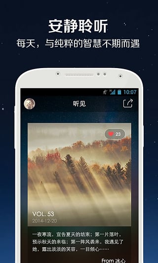 《聽見》,最純粹的精神閱讀應(yīng)用,每天給自己幾分鐘時間,換一種方式閱讀世界,聆聽一篇最精致的語音美文,開啟心靈休憩、發(fā)現(xiàn)的旅程。《聽見》,重新發(fā)現(xiàn)雙耳的力量,閉上雙眼,打開雙耳,世事蕪雜拋卻身后,簡單寧靜回歸心頭,那一刻,讓自己與世界上最激動人心的智慧不期而遇。