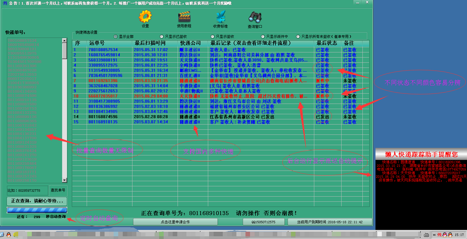 懶人批量快遞跟蹤助手軟件是一款強(qiáng)大的快遞跟蹤軟件,它支持國(guó)內(nèi)大部分快遞,比如中通、圓通、申通、國(guó)通、匯通、韻達(dá)、順豐等等快遞,這款快遞查詢(xún)助手可以幫助你定時(shí)自動(dòng)查詢(xún)、批量查詢(xún)、批量導(dǎo)出數(shù)據(jù)、后臺(tái)跟蹤快件如到達(dá)派件公司顯示派送 第一時(shí)間提示用戶(hù),還有更多功能請(qǐng)親自體驗(yàn)非常適合各快遞公司客服人員、仲裁,跟蹤問(wèn)題件。【軟件特點(diǎn)】