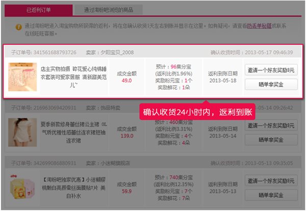 第四步:確認(rèn)收貨后淘粉吧就會(huì)發(fā)放返利
