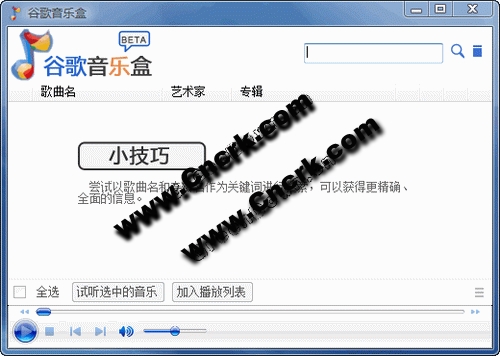 谷歌音樂盒是一款完全免費(fèi)的網(wǎng)絡(luò)音樂播放軟件,意在讓用戶更方便地發(fā)現(xiàn)和欣賞音樂,所有音樂都是由“巨鯨音樂網(wǎng)" (top100.cn)提供的正版音