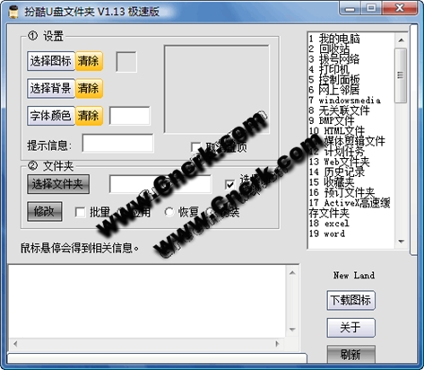 幾乎每個人都有自己的U盤,那么你的U盤中的文件夾夠炫嗎?如果你還在用系統(tǒng)默認的圖標,還在用蒼白在背景,如果你對它們不滿意,那請你跟我來吧,本軟件可以很輕松的讓你的文件夾炫起來。
