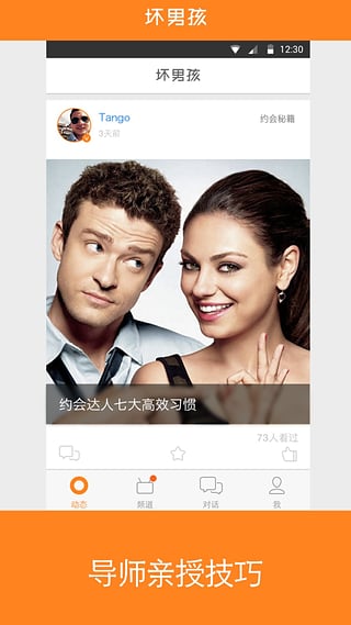 壞男孩是一款男人必備的約會神器!這里是世界最大的男性約會技巧、戀愛藝術(shù)(PUA)社區(qū)。你可以在這里獲取追女孩子的技巧、戀愛技巧和約會秘籍,幫你更高效地找女朋友。有了壞男孩,你不再需要在陌陌上追女生,也不需要在花田珍愛上相親找女友。在這里,你可以找到男人裝GQ沒有的追女生技巧,找到跟你志同道合的僚機和搭訕大師幫你變成一個Hot男人和時尚先生。【軟件特點】