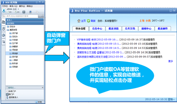 OA系統(tǒng)內(nèi)部的新聞、公告、消息、待辦事物等都可通過(guò)RTX客戶端提醒并點(diǎn)擊直接進(jìn)入辦理界面