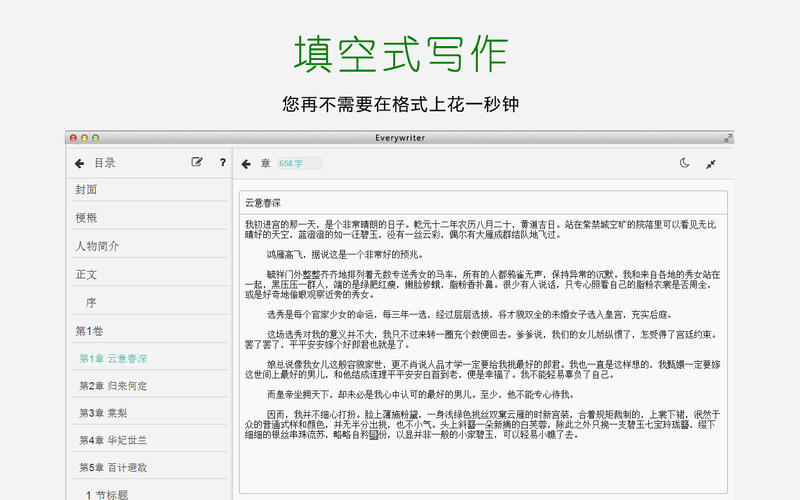 壹寫作提供了多種可一鍵生成的長中短篇小說模板,引入了可擴(kuò)展的主題引擎,引入了隨時預(yù)覽生成的寫作模塊及仿真閱讀體驗(yàn)。壹寫作提供了多種導(dǎo)出功能,使您可以輕松將作品出版至其它的如(騰訊文學(xué),豆瓣文學(xué))等文學(xué)平臺。壹寫作同時提供了一個指導(dǎo)性的api開放平臺,任何實(shí)現(xiàn)該api的文學(xué)網(wǎng)站都可以輕松接入壹寫作使您的作品商品化成為可能。