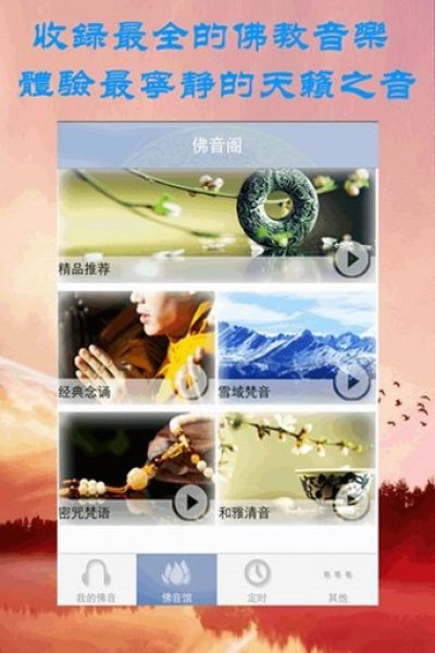 體驗(yàn)最寧?kù)o的天籟之音,讓您在忙碌中放松心靈,驅(qū)逐煩惱??!細(xì)心的定時(shí)設(shè)置,早晚課自動(dòng)音樂(lè)提醒,讓您更易親近佛法。為您提供最全面的佛教音樂(lè),經(jīng)典經(jīng)文念唱