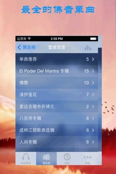 1、 眾多靜心佛曲與密咒真言供您試聽2、 可定時(shí)設(shè)置,每天定時(shí)自動(dòng)播放歌曲,提醒您早晚功課,也可做音樂(lè)鬧鐘