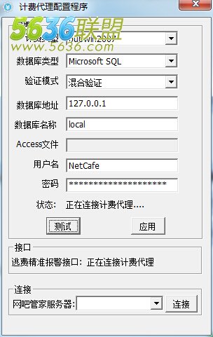 狀態(tài)欄上的第二個圖標(biāo)即代表計費(fèi)代理工具的連接狀態(tài)。在啟用網(wǎng)吧計費(fèi)代理工具時,選擇網(wǎng)吧目前使用的計費(fèi)類型,驗(yàn)證模式建議為“混合模式”,然后輸入數(shù)據(jù)庫的用戶名和密碼,點(diǎn)擊測試驗(yàn)證或者直接點(diǎn)擊應(yīng)用保存設(shè)置。連接成功后,最下方會顯示已連接網(wǎng)吧管家服務(wù)器的地址。