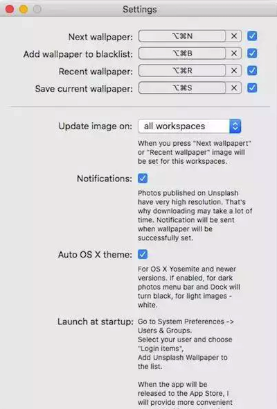 Unsplash for mac是一款常駐系統(tǒng)菜單欄的小應(yīng)用,安裝完成后會(huì)在菜單欄中出現(xiàn)一個(gè)照相機(jī)的 icon。Unsplash for mac定義了四個(gè)全局快捷鍵分別用來切換壁紙、加入黑名單、查看當(dāng)前壁紙、保存當(dāng)前壁紙。