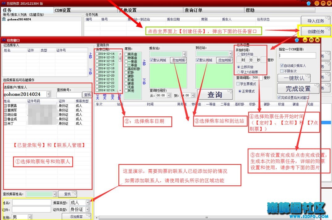 第三步:添加購票任務(wù)(參照下圖的設(shè)置順序①?⑤)