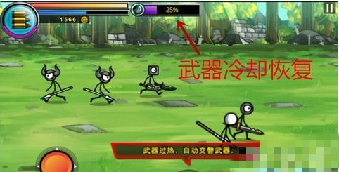當(dāng)同一件武器攻擊次數(shù)過多時,武器會過熱,這時游戲中會自然切換成備用武器。當(dāng)然,玩家在過熱之前想主動切換武器的話,只要按一下屏幕下方的武器按鈕就可以了。屏幕上方的百分比槽表示的是正在冷卻的武器恢復(fù)的數(shù)值?;謴?fù)超過50%的武器就能再次拿出來使用了。