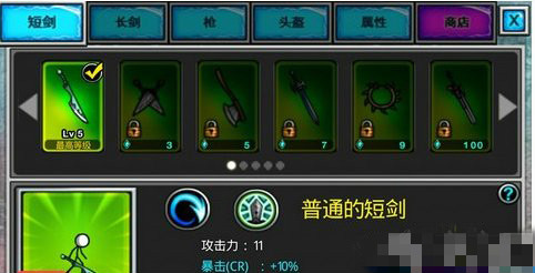 游戲當(dāng)中的武器是可以升級的,在武器界面的右下角有升級按鈕,點(diǎn)擊之后消耗金幣就能升級了。在游戲初期,短劍和長劍各升級一把武器就可以了,剩下的金幣要攢到游戲后期買高級的強(qiáng)力武器。
