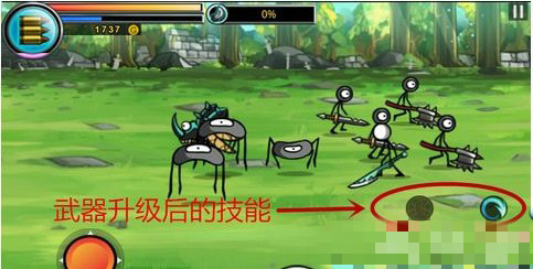 武器升到一定等級之后就會附加攻擊技能,如圖所示,在戰(zhàn)斗畫面中右下角的攻擊按鈕上方會多出兩個小按鈕。灰色的是被動技能,不需要按。藍(lán)色的是攻擊技能,點(diǎn)擊之后會施放一個特殊攻擊。