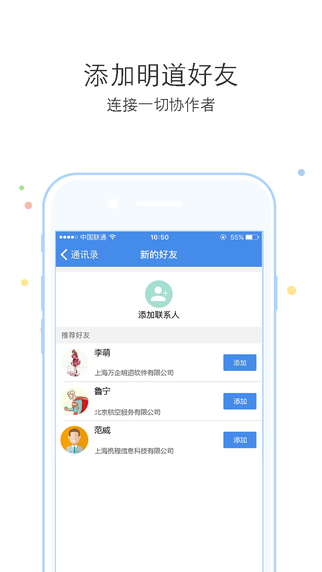 3.每個用戶都將擁有一個明道個人賬號,有協(xié)作需求的人只要添加明道好友即可展開協(xié)作